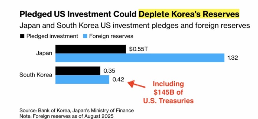 Now, Korea already has a reserves crisis. They don’t have enough money versus what Trump wants. Their $420 billion in reserves also includes $145 billion in US treasuries.