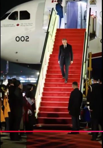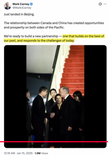 And while all this black buff [?] is going on, another traditional US ally is breaking ranks. We are truly witnessing a change in a global order. This will definitely accelerate de-dollarization and bring more economic pain for the Trump administration. Canada is moving closer to China. Our joke last year about Carney drinking tea in Beijing has come true. When Carney arrived in China, there was pomp and pageantry. He was literally given the red carpet treatment, with an honor guard, which is one of the higher respects that can be given. Optics are very important to the Chinese. It shows a big shift, and China rolling out all the stops to swing Canada towards Asia is very significant.