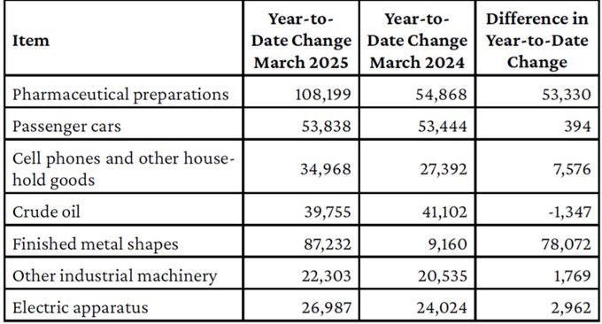 3/ These are easily stored goods and are medically important raising the possibility of inventory buildup pre-tariffs. This aligns with the pre-April surge in the trade deficit in goods.