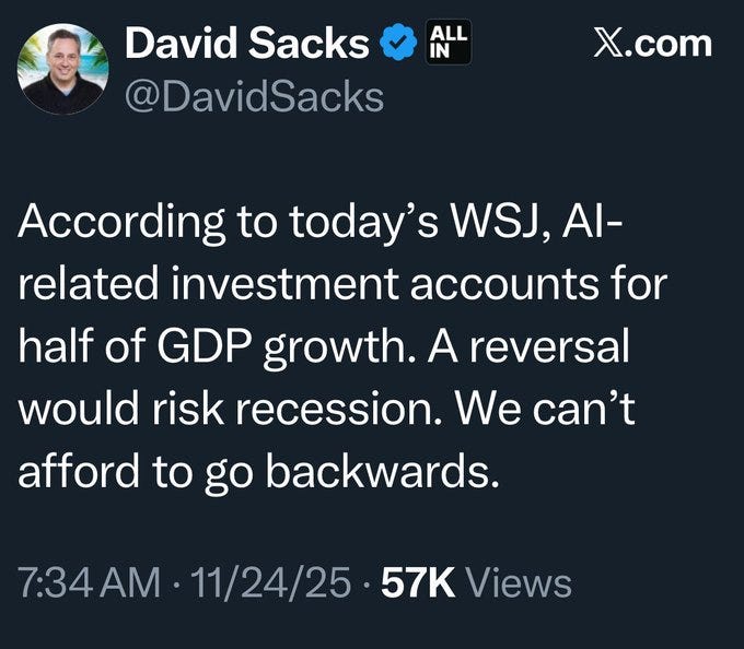According to today’s WSJ, AI-related investment accounts for half of GDP growth. A reversal would risk recession. We can’t afford to go backwards.