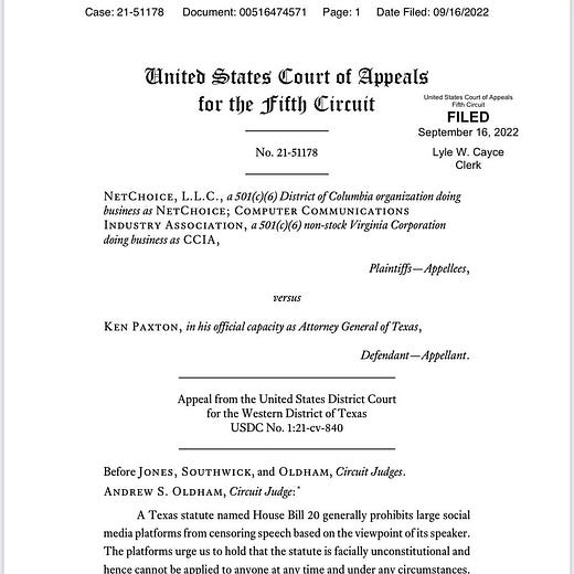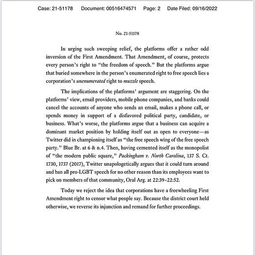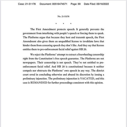 Going hand in hand with this case is a decision at the Appellate level in Texas. I briefly referenced the case last night in a comment. The decision is being billed as a huge win for our First Amendment rights over against Big Tech censorship, and I’m a bit surprised not to see more comment on the case, despite its 113 page length. That estimate of the case’s importance is, IMO, a correct assessment, and the case will likely find its way to the SCOTUS—where there is reason to hope that it will receive favored treatment: