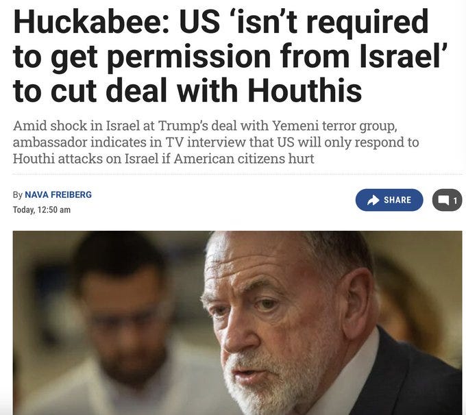 Who knows if any of this is true or just more Trumpian rhetoric—like about the Houthis “capitulating”—but there does seem to be some fire behind the smoke. The linkage to the debacle of Trump’s war on Yemen resonates. In particular, Huckabee’s statement that the US will only respond to Houthi attacks on Israel if US citizens are harmed seems significant. Granted, one could argue that virtually any attack on Israel would be likely to harm a US citizen. Still … time will tell.