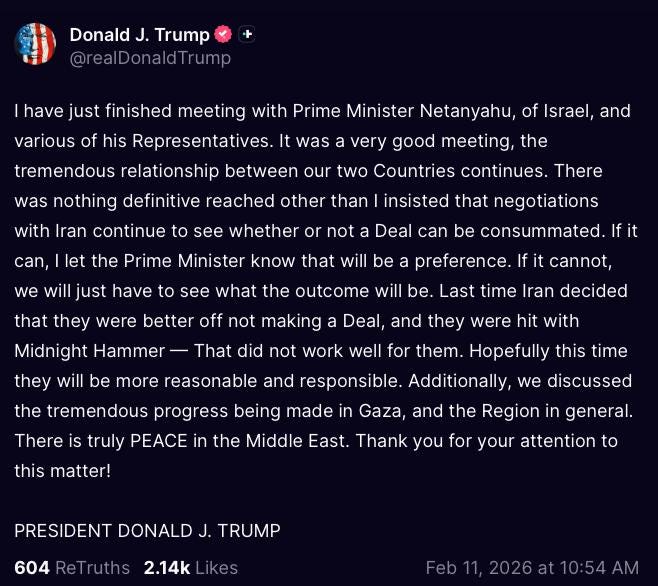 Devil's advocate, if Trump and Netanyahu had decided on the details of launching an attack, would he have put that out in a tweet, or would they play with ambiguity? Moving all that military hardware around isn't free, although looking at the markets, it seems the bets at least for February are mostly off (https://polymarket.com/event/us-strikes-iran-by, gold falling)